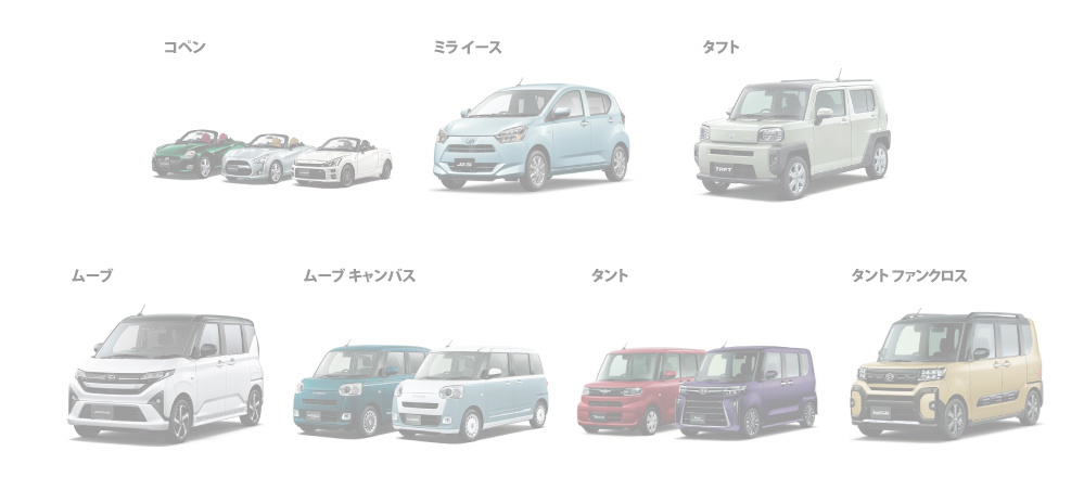 Selling Car 車両販売 ダイハツのサブディーラーとして新車を販売。あなたにピッタリの車をお探しします。 広いショールームにはダイハツの新車を常時5台展示。分からないことはスタッフにどんどん聞いてください。見るだけでも全然OK♪実際に見て、 触れて、あなたのお気に入りを見つけてください。全メーカーの中古車販売もしています。 ダイハツの新車情報はこちら▼ 新・ハイゼット登場! 軽自動車ラインナップ 小型乗用車/普通乗用車 ラインナップ 商用車